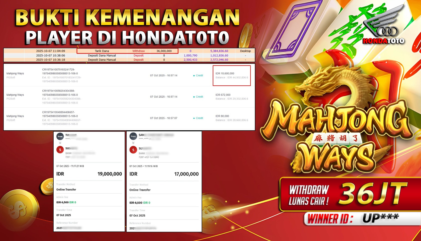 Bandar togel HONDATOTO merupakan bandar togel dan slot online yang membayar semua kemenangan member hingga lunas. Setiap pembayaran pada situs kami dilakukan dengan cara transfer ke rekening tujuan yang sudah di daftarkan pada situs togel online kami, Pembayaran hanya dapat di proses jika rekening yang di daftarkan telah valid dan dapat di transfer. Semua kemenangan member yang mendapatkan hadiah jackpot terbesar akan kami posting agar semua pemain dapat melihat bandar situs terpercaya HONDATOTO ini membayar semua kemenangan member hingga lunas. Setiap postingan yang kami posting akan kami lakukan sensor pada nomor rekening 4 digit dan nama rekening untuk menjaga privasi dan kerahasiaan member. Postingan Jackpot yang kami posting agar member atau pemain yang belum pernah bermain bisa melihat bandar togel Bukan Kaleng Kaleng Seperti HONDATOTO ini, Semua postingan jackpot yang kami posting dapat di lihat data keasliannya melalui nomor reff yang di tunjukan pada bank atau mbanking saat kita melakukan transfer.