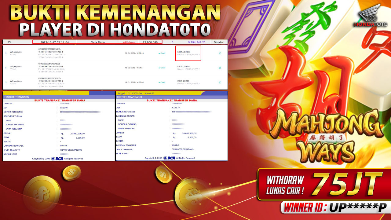 Bukti Kemenangan 17 OKTOBER 2025 Di MAHJONG WAYS WD 75 Juta